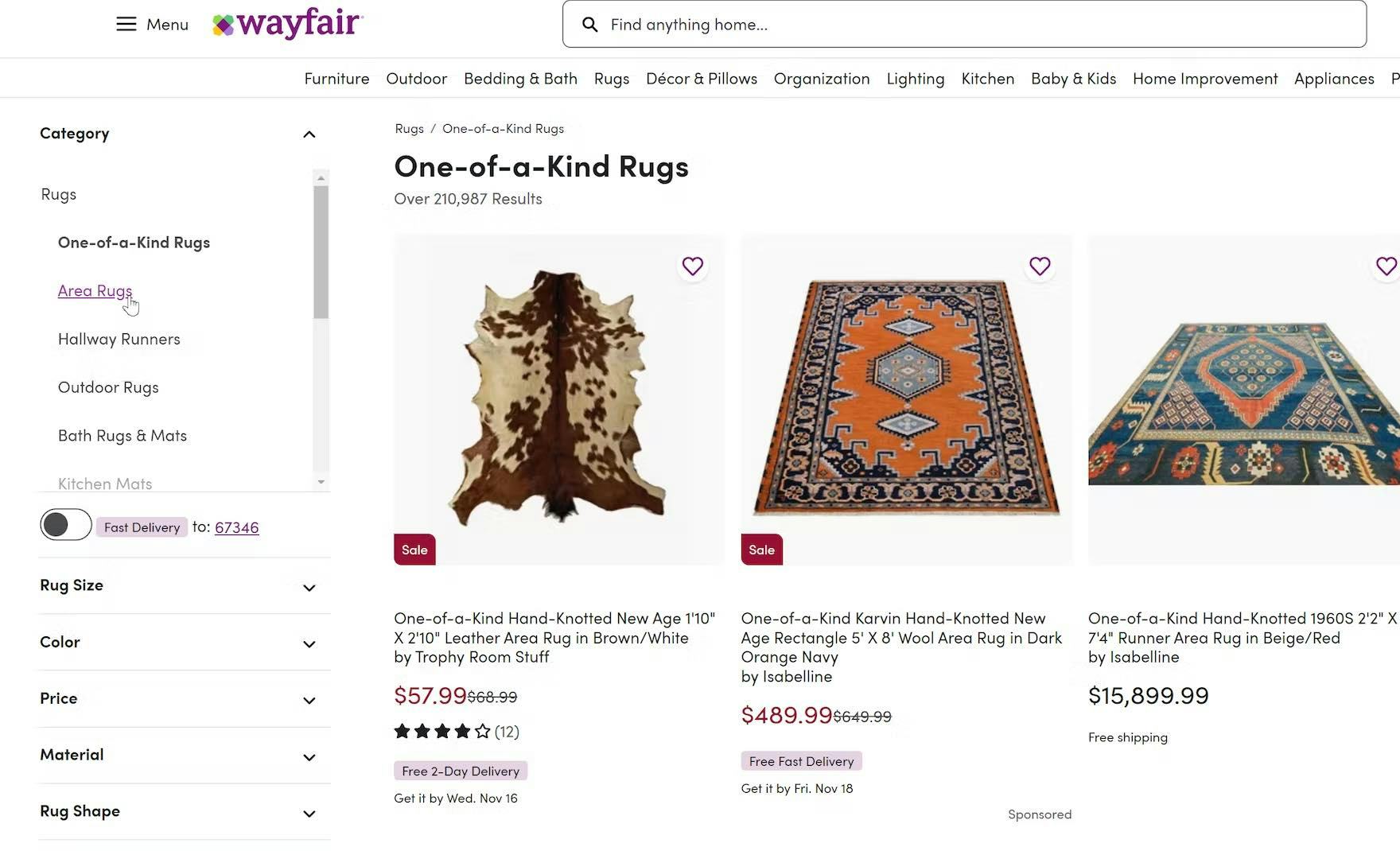 Likewise, “One-of-a-Kind Rugs” and “Area Rugs” are separated into distinct categories at Wayfair, even though their attributes are identical. As a result, users won’t be able to easily compare all rugs that might be suitable.