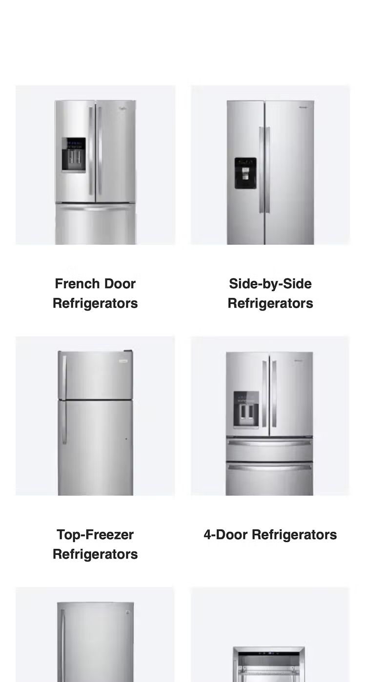 Because different types of refrigerators on Lowe’s are implemented as categories (first image), users who don’t have a preference between, say, “French Door Refrigerators” and “Side-by-Side Refrigerators” will find it extremely difficult to compare and evaluate their features because they can’t be viewed together in one list (second image).