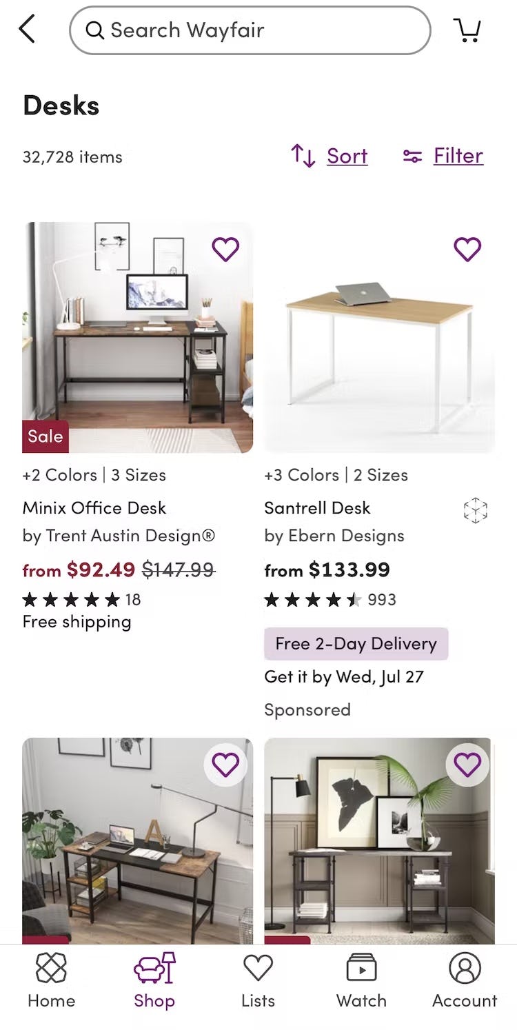 On Wayfair’s mobile site, all types of desks are shown in a product list (first image), with filters such as “Shape” available (second image) to narrow the list by relevant criteria. As a result, users can get an overview of the different types before applying filters to narrow the list.