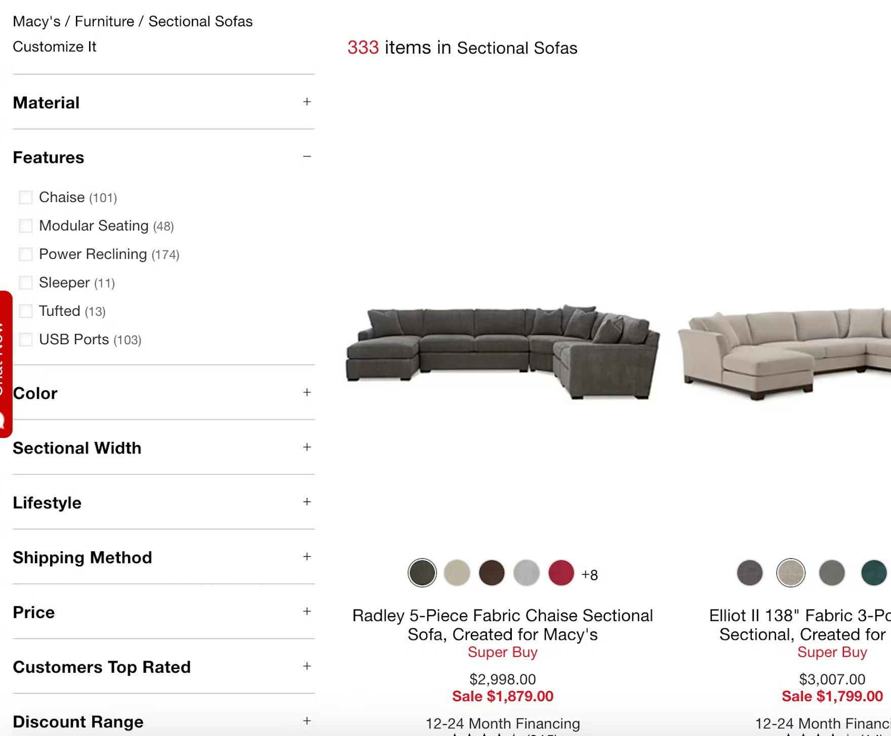 While both the “Chairs & Recliners” and “Sectional Sofas” categories at Macy’s have a “Features” filter type, the filter options are in fact very different between the two product types. For example, “Chairs & Recliners” has “Features” filters for “Swivel”, “Glider”, and “Wingback” (first image), attributes that aren’t relevant for the “Sectional Sofas” category (second image). Thus it’s appropriate to have separate subcategories for “Chairs & Recliners” and “Sectional Sofas”.