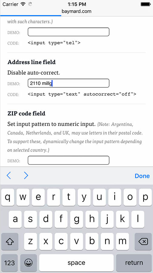In comparison, notice how the keyboard doesn’t try to correct the user’s input in our ‘best practice’ example where auto-correct has been disabled for this field type.