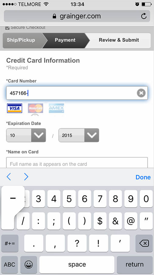 During usability testing, typos were much more common on sites that relied on the standard keyboard for numeric inputs, as seen on Grainger.