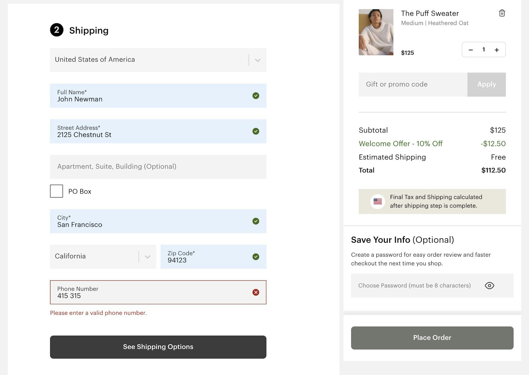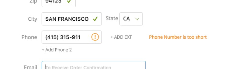 Instead of simply saying “Provide a valid phone number” users at B&H Photo are provided with “Adaptive Error Messages’’, custom to the specific subissue that caused the validation logic to trigger. Here users are informed that “Phone Number is too short”.