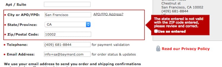 Similarly, instead of saying “Invalid ZIP code”, users were given the much more specific error “The state entered is not valid with the ZIP code entered”.