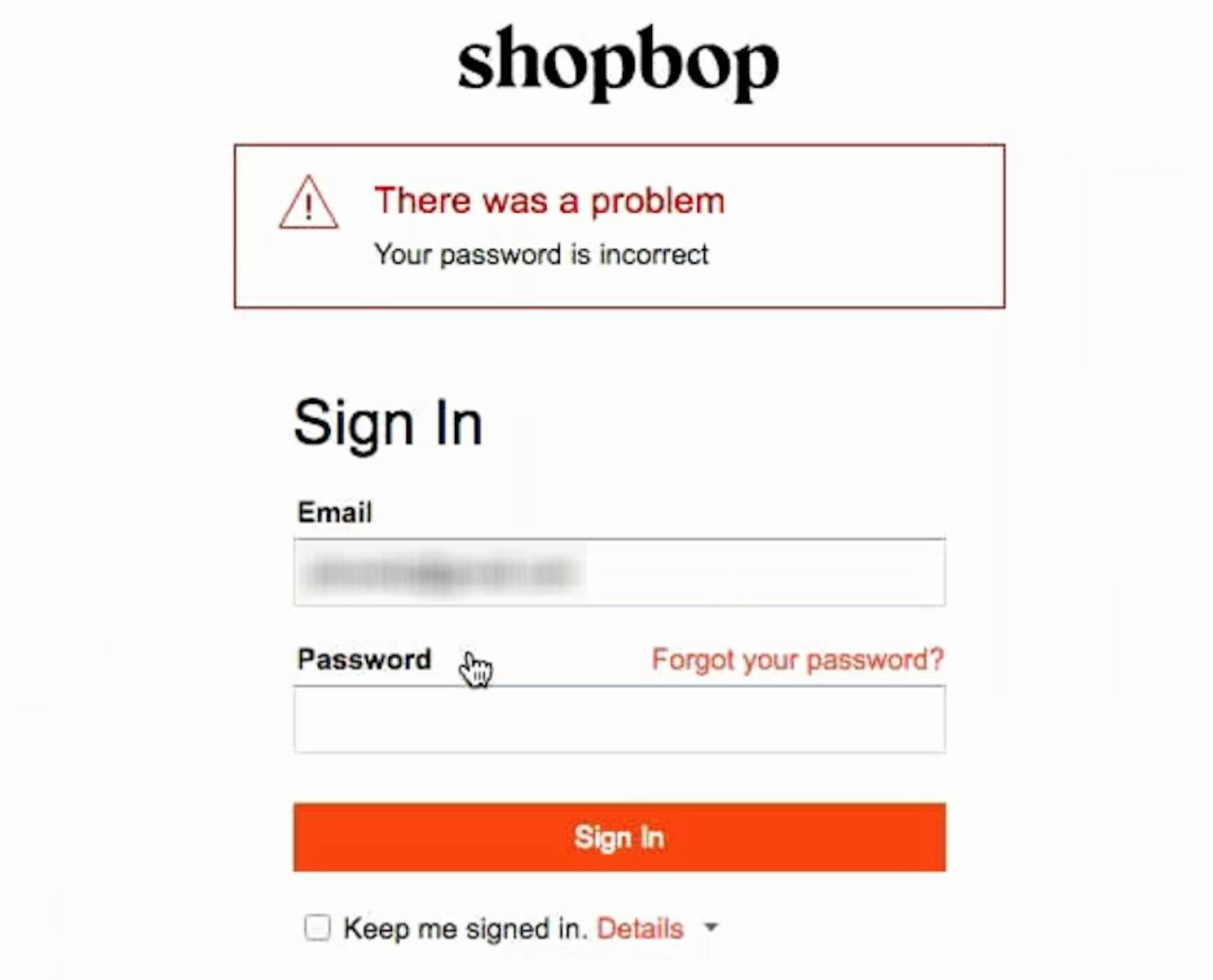 On the other hand, at Shopbop a participant received an error message stating that “Your password is incorrect”. Helpful error messages such as this allow users to focus on the field that caused the error.