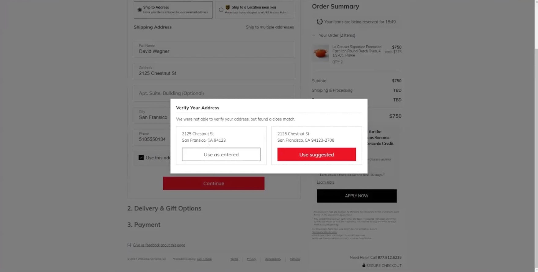 “I guess if it was spelled right, that would help. But they caught that, so that’s good.” The address validation at Williams Sonoma caught this participant’s misspelled city name, which in reality could result in delayed shipping or a misdelivery.