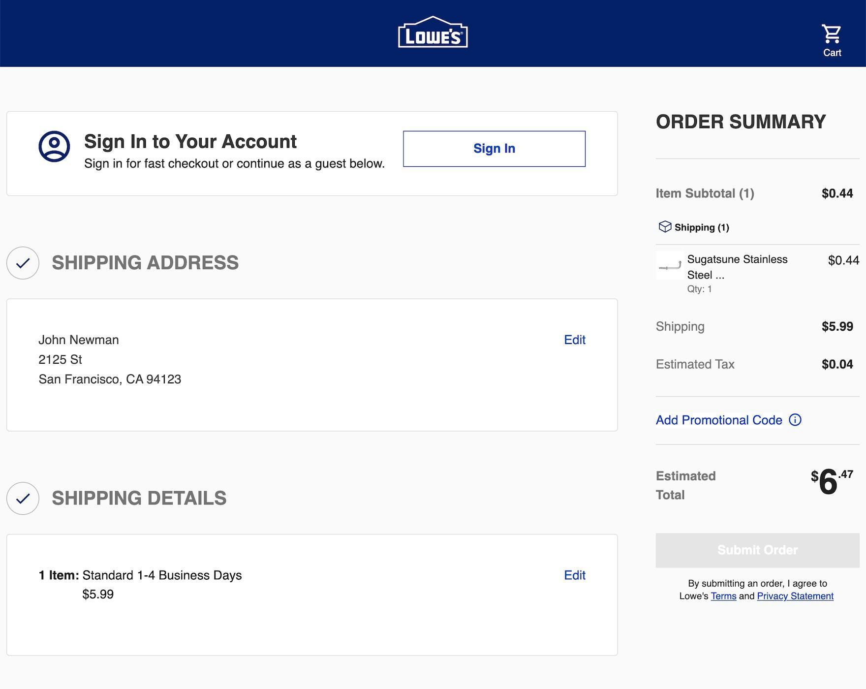 At Lowe’s, users can complete checkout without being alerted to mistakes in address fields, such as the incomplete address shown here. Without adequate notification, some users may not notice their mistake until it’s too late, leading to significant customer service issues.