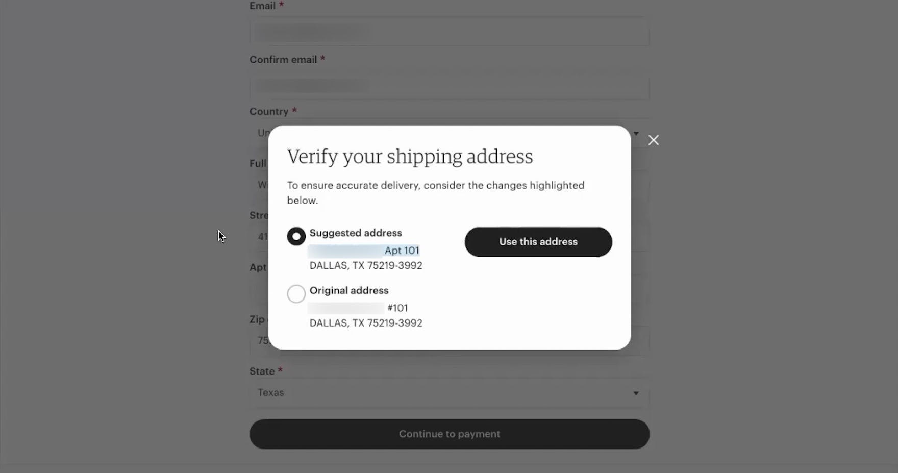 Overall, in testing we observed that an overlay containing the original entry and validator-generated suggestions guaranteed participants were able to verify the shipping address before continuing.