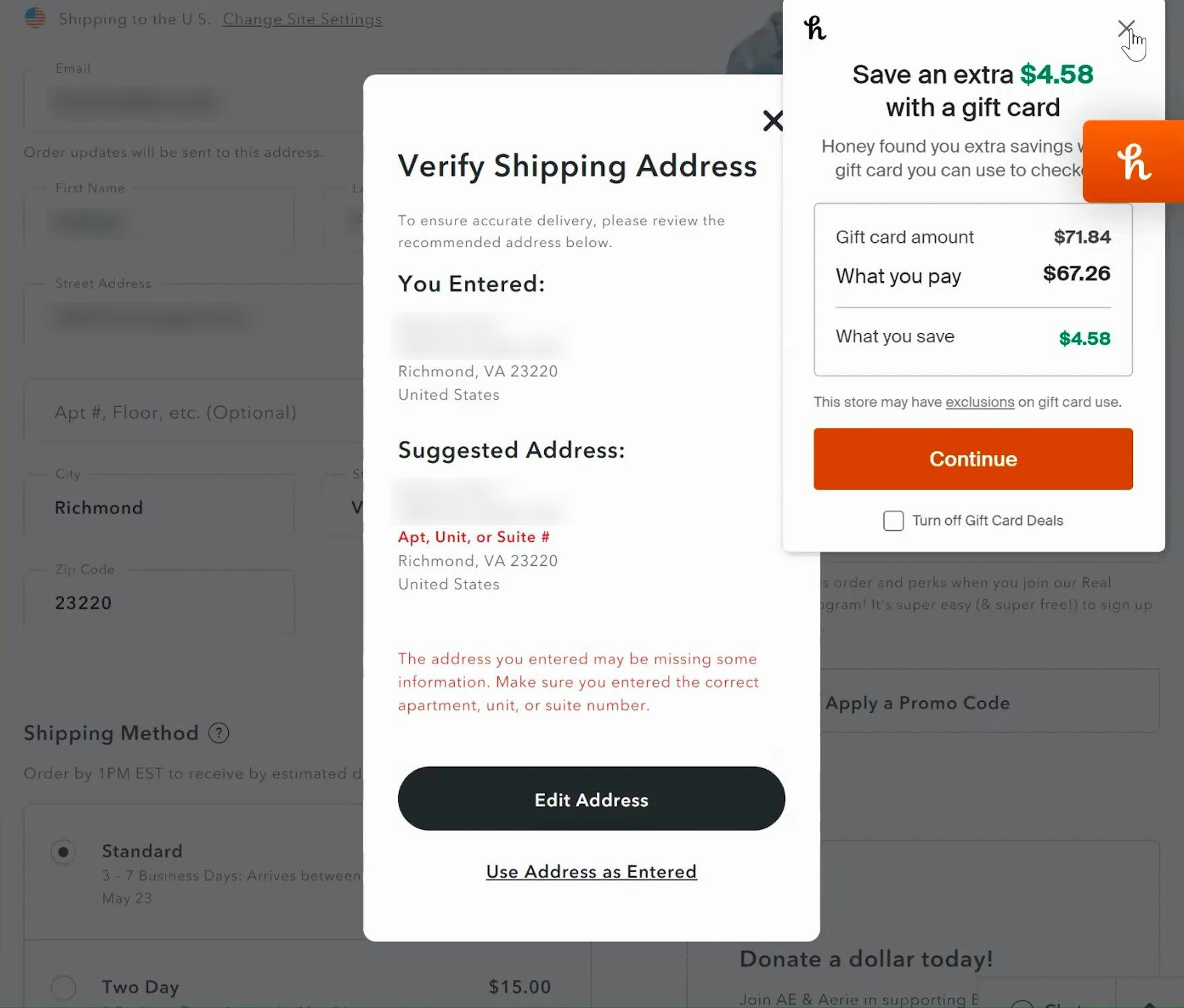 “And then this happens.” Selecting her address from the site’s “Fully Automatic Address Lookup” feature did not automatically furnish this user’s apartment number at American Eagle (first image). After skipping the “Address Line 2” field and attempting to continue, however, the site’s address validator caught the missing data. Overall, “Fully Automatic Address Lookup” is not a complete solution to ensuring accurate, deliverable addresses.