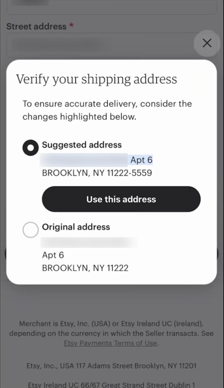 “My big thing on this is making sure that my shipping address is correct. I love the fact that it popped up the suggested option because my understanding is when it does, that’s a verified address that the post office definitely has.” This participant at Etsy appreciated the clear address validator overlay as a failsafe for ensuring he had entered his address correctly.