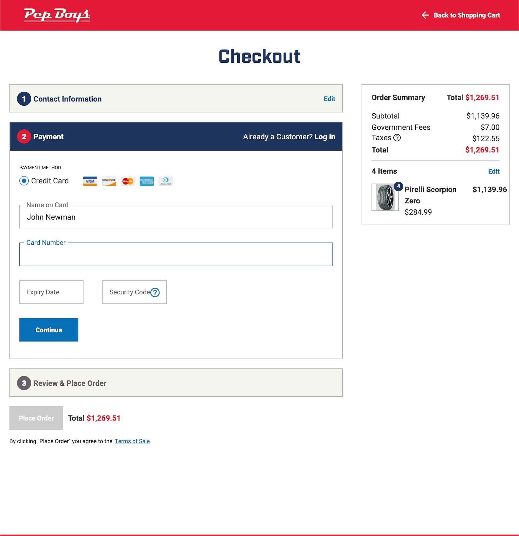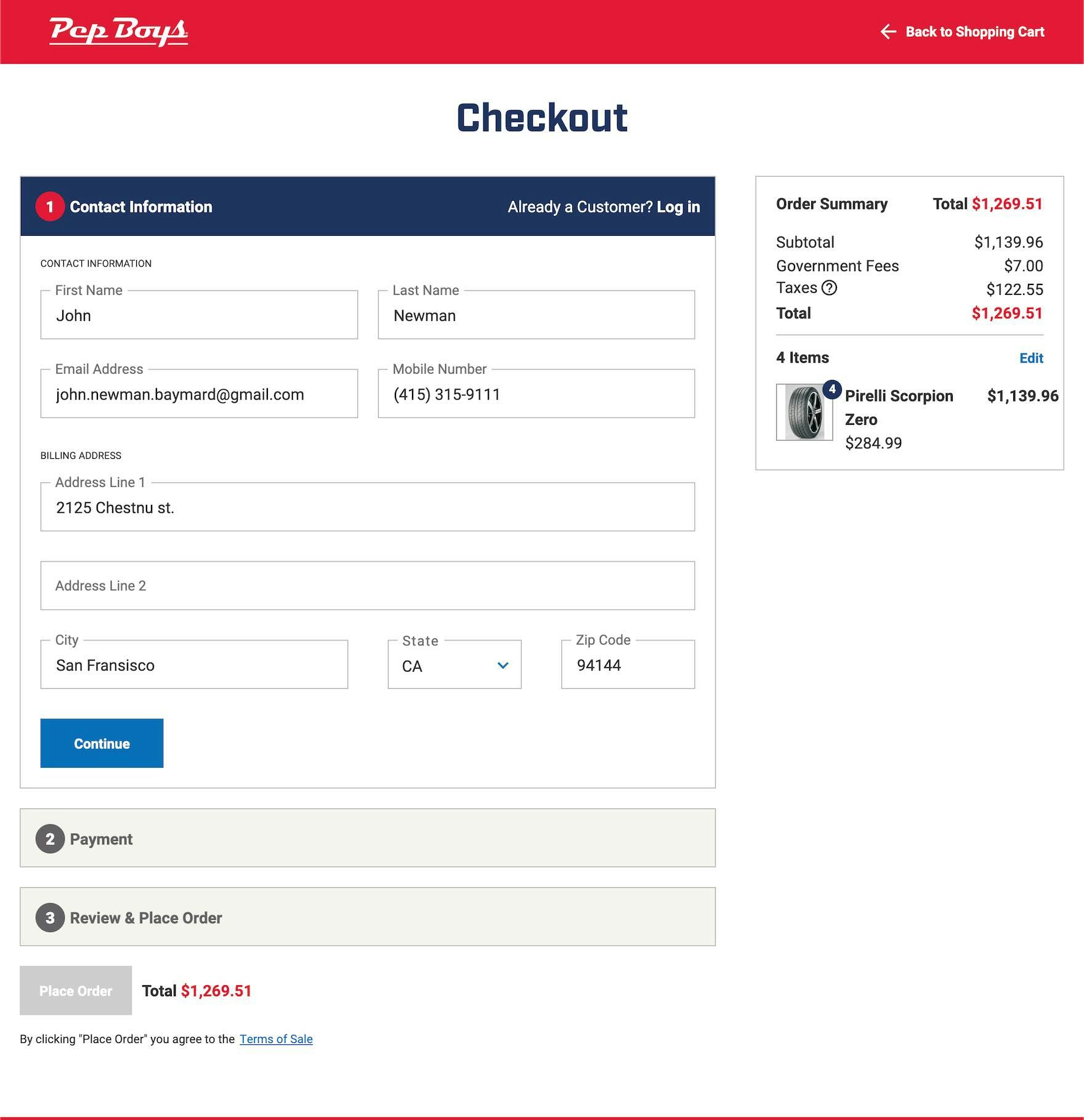 This incorrect address containing multiple errors — a misspelled street name, city name, and mismatched ZIP code (first image) — was readily accepted at Pep Boys, allowing users to continue through checkout without any notifications that the address may result in a missed or delayed delivery (second image).