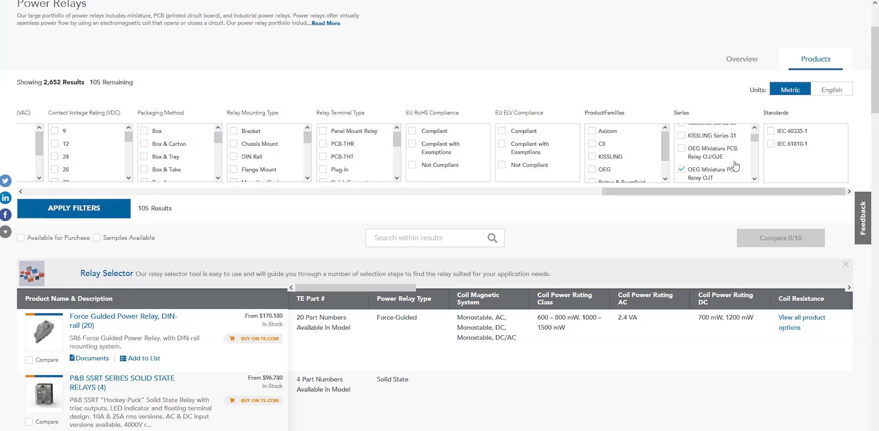 ”There’s a lot of these. I’m not going to find what I want quickly”, remarked a participant as he scrolled through the long list of “Series” filter options for “Power Relays” at TE Connectivity. He abandoned that filter and decided to focus on the “Relay Mounting Type” filter instead.