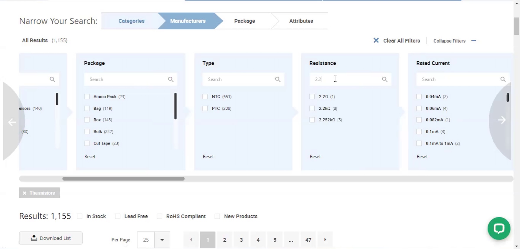”Okay. ‘Resistance’. Um, let’s see. Do you have ‘2.2MΩ’? No, you don’t. ‘200kΩ’.” This participant (a field engineer) shopping for thermistors at Future Electronics searched for a resistance value in “megaohms” (MΩ) (first image), then, based on the results, switched his search to “kiloohms” (kΩ) (second image).
