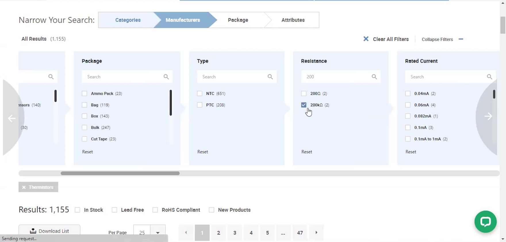 Indeed, testing revealed that participants were able to quickly find desired filter options when there was a search feature within a filter type with many filter options — as a participant (an electronics engineer) positively remarked after searching a “Resistance” filter which contained hundreds of options, “I’m going to go ahead and use the search feature and see if I can do ‘1.2K’. Okay, that does come up pretty easily. So, that was fairly simple.”