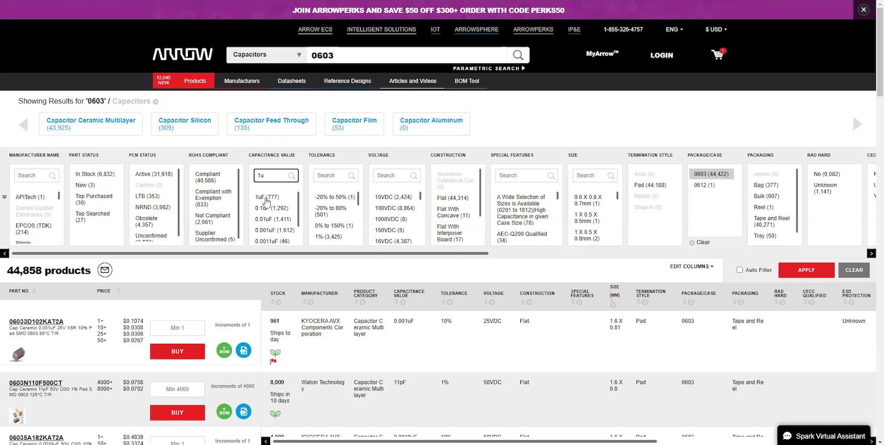 After briefly scrolling the long list of “Capacitance Value” filter options at Arrow Electronics, this participant decided to search. He quickly found the desired “1μF” value and filtered the 44,000+ capacitors to 777.