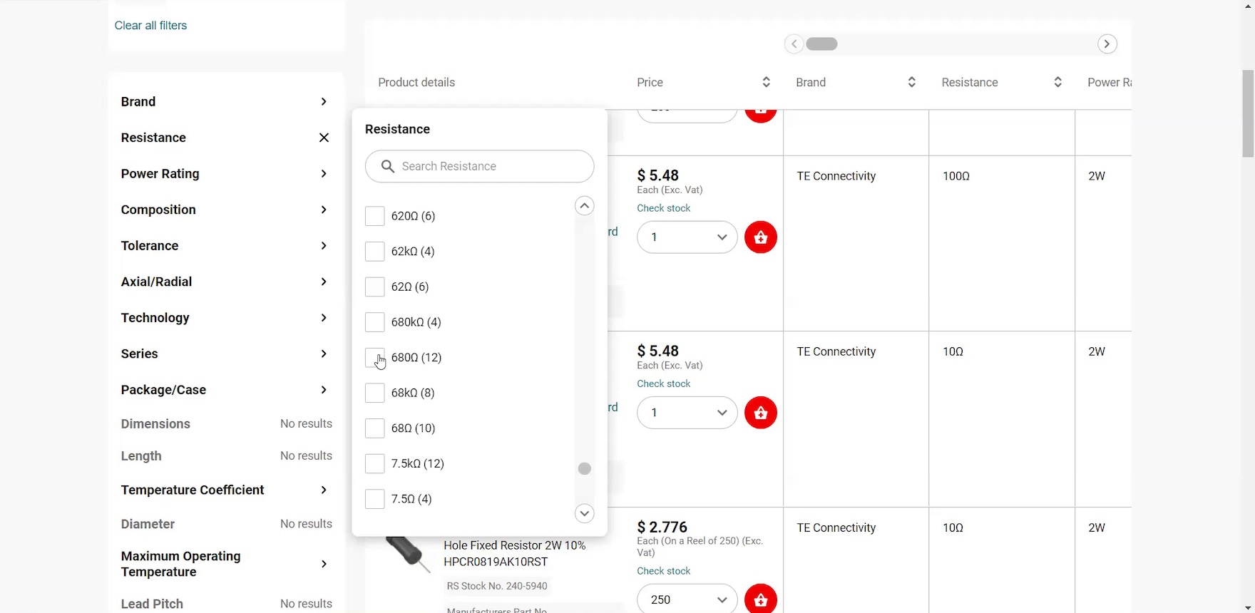 ”This is very odd to me. They don’t have it sorted — I can see what they did here. They have ‘680 kiloohms’ and then ‘680 ohms’, which is a very big range right next to each other!” This participant shopping for through-hole resistors at RS Components, Ltd. questioned the numerical order of the “Resistance” filter options. He eventually gave up scanning the list and turned his focus to the search box to locate the desired resistance value.