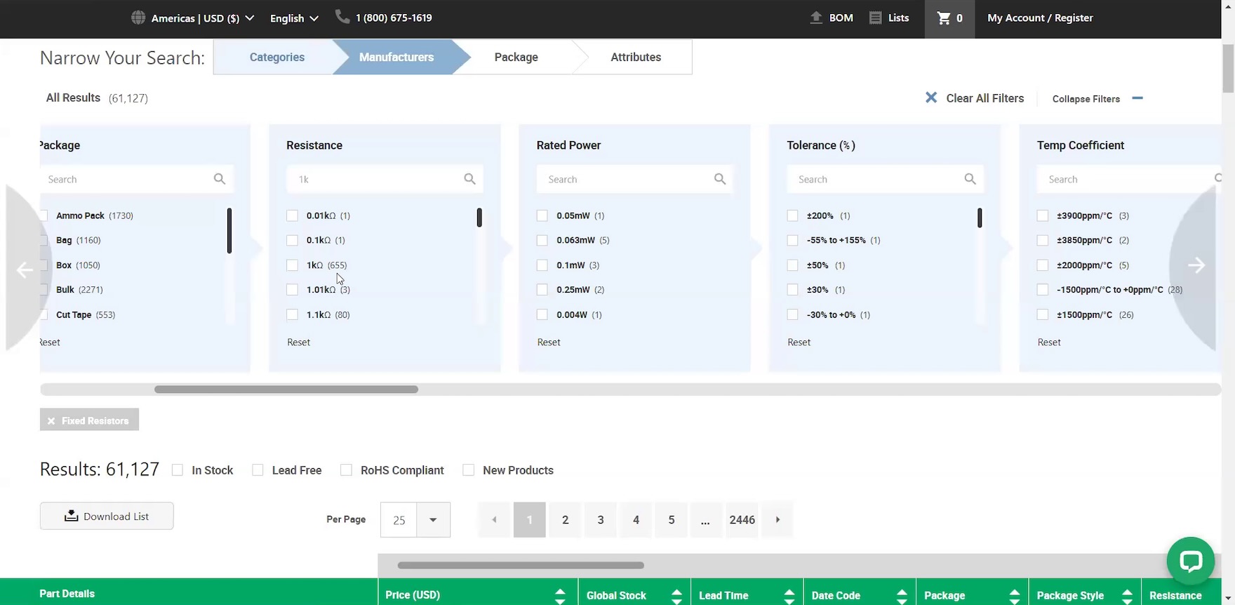 ”So, I’m just going to use the search here…So, I type in ‘1 kiloohm’, and I select that…and then ‘1,000 ohms’, which is the same thing.” A participant (an electronics engineer) quickly filtered over 61,000 resistors in the “Product Table” at Future Electronics to just over 650. He then applied two additional filters, further reducing the number of parts.