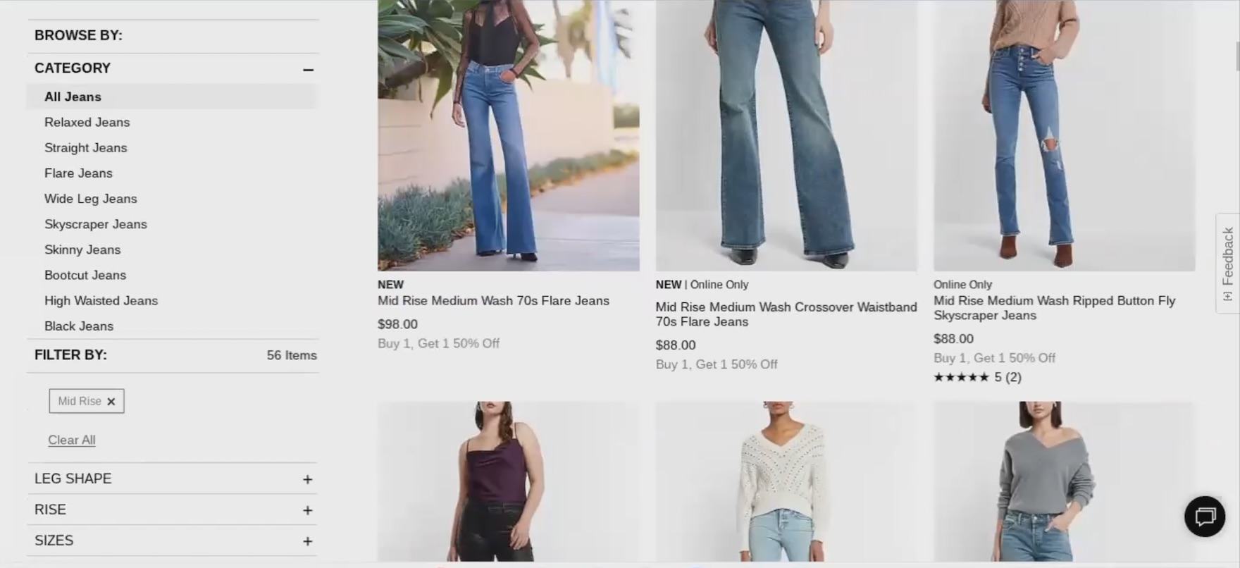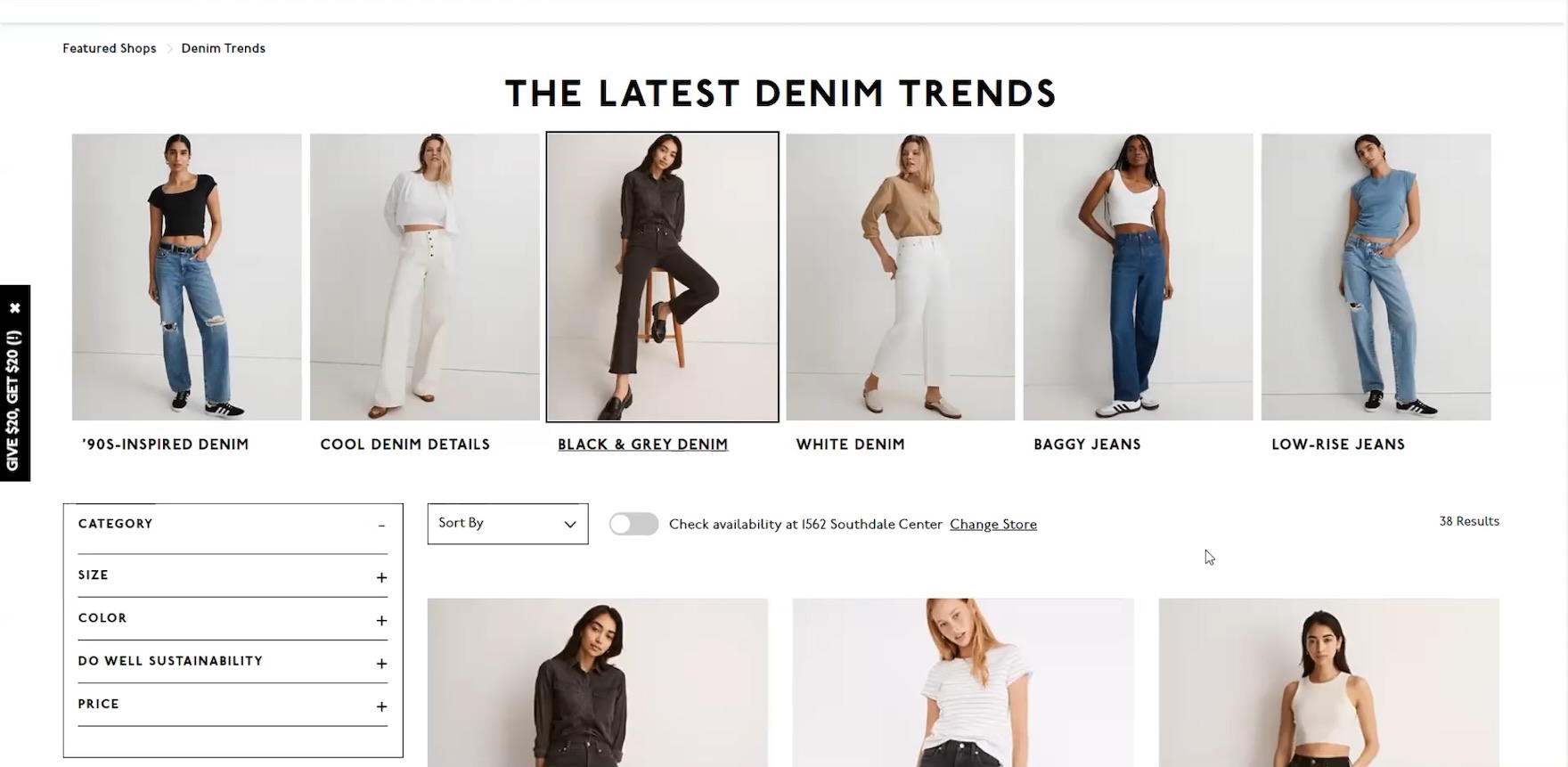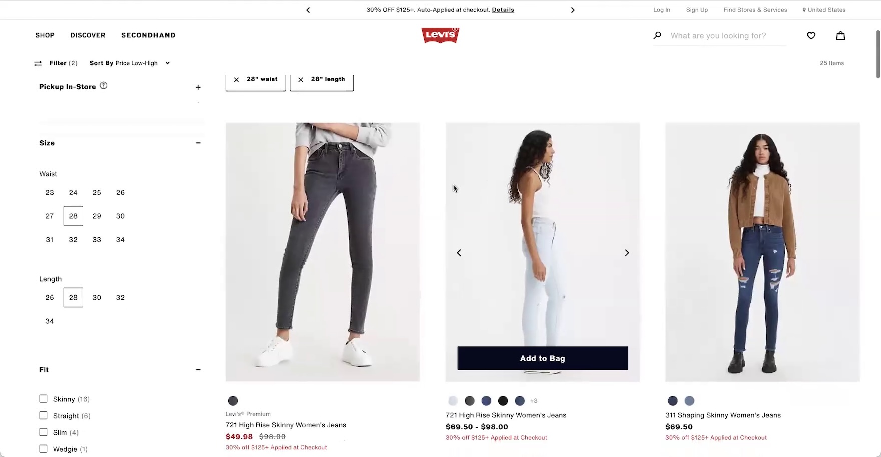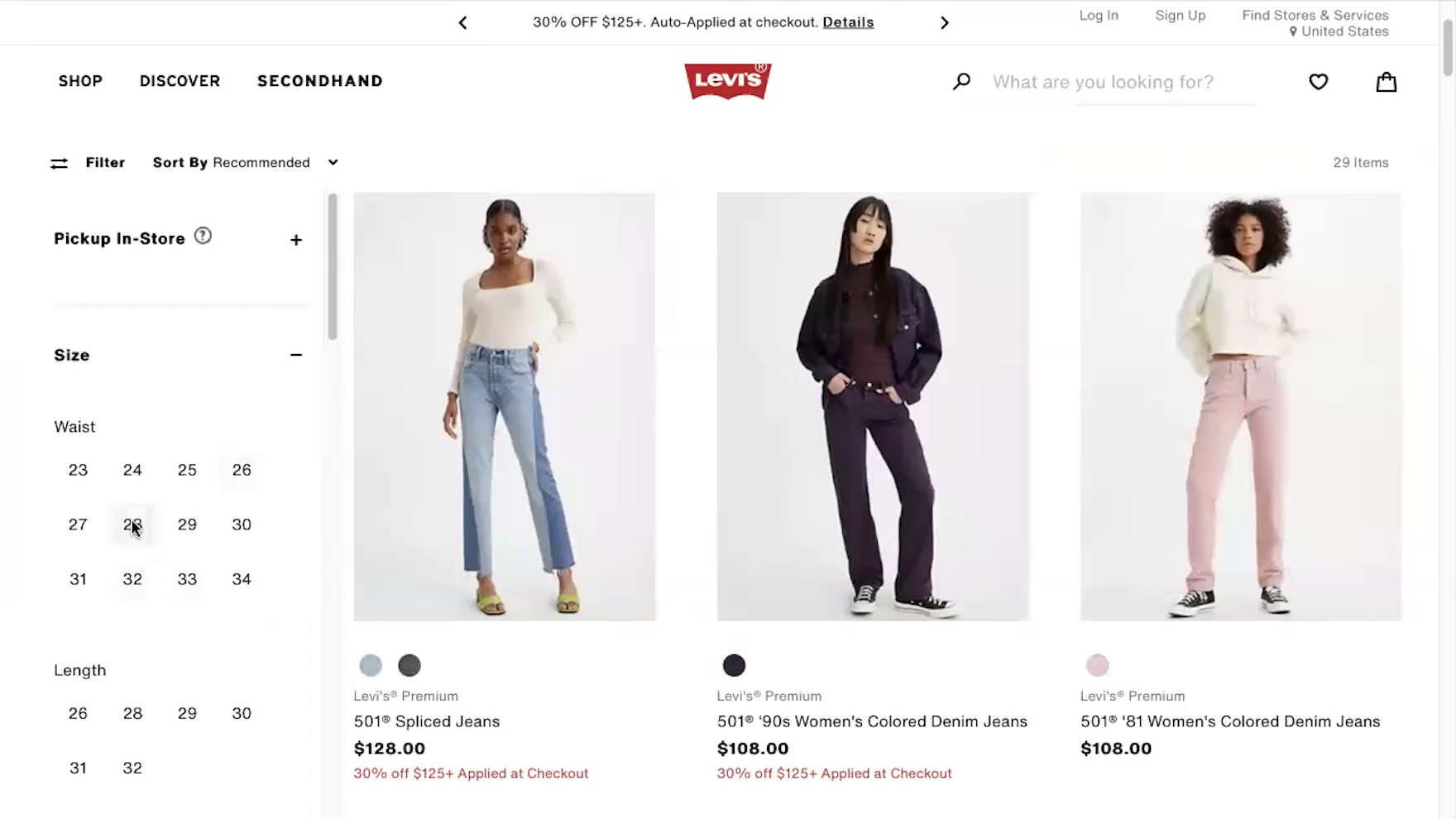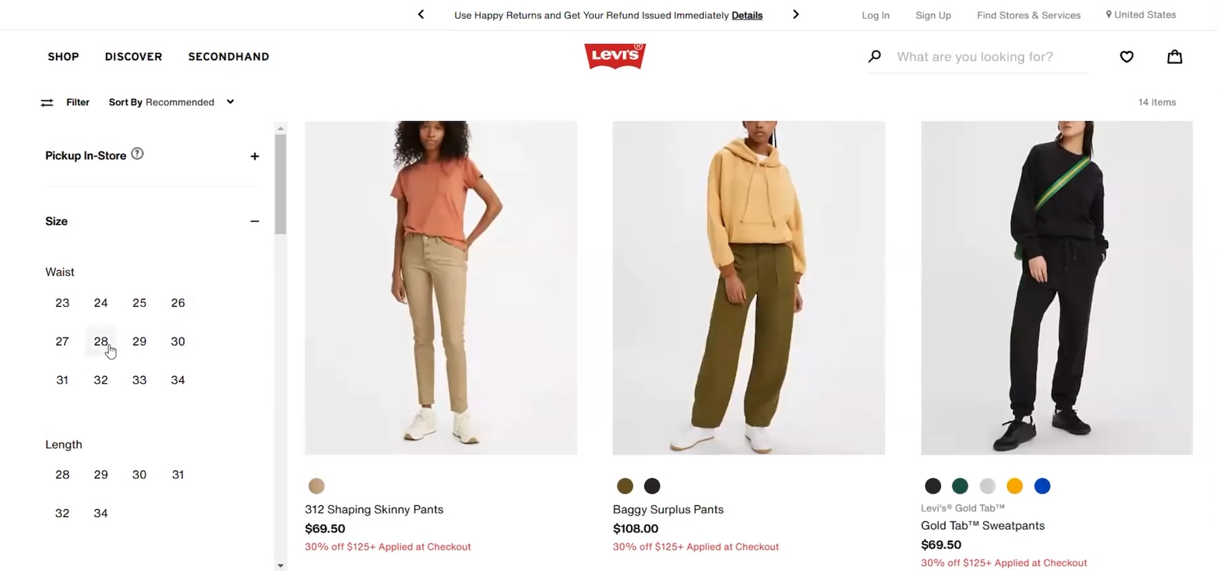 ”So, I will…just filter by size. So ‘28’, and because I self-identify as fun-sized at ‘5’2”’, I’ll go with the length as well!” When the “Size” filter is expanded by default and positioned at the top of the sidebar — as in both these instances at Levi’s — users are more likely to notice it.