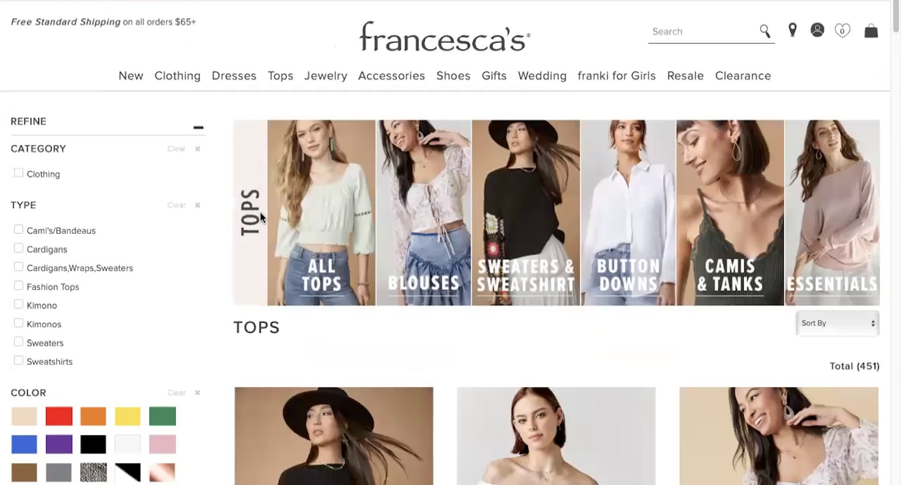Here in Francesca’s “Tops” category the “Size” filter option was not visible within the viewport because it was pushed down by the “Color” filter.