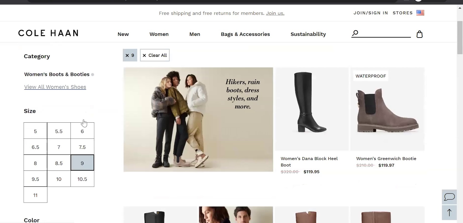 At Cole Haan, the “Category” filter only displays the current scope, allowing the “Size” filter maximum visibility even though it is the second filtering option.