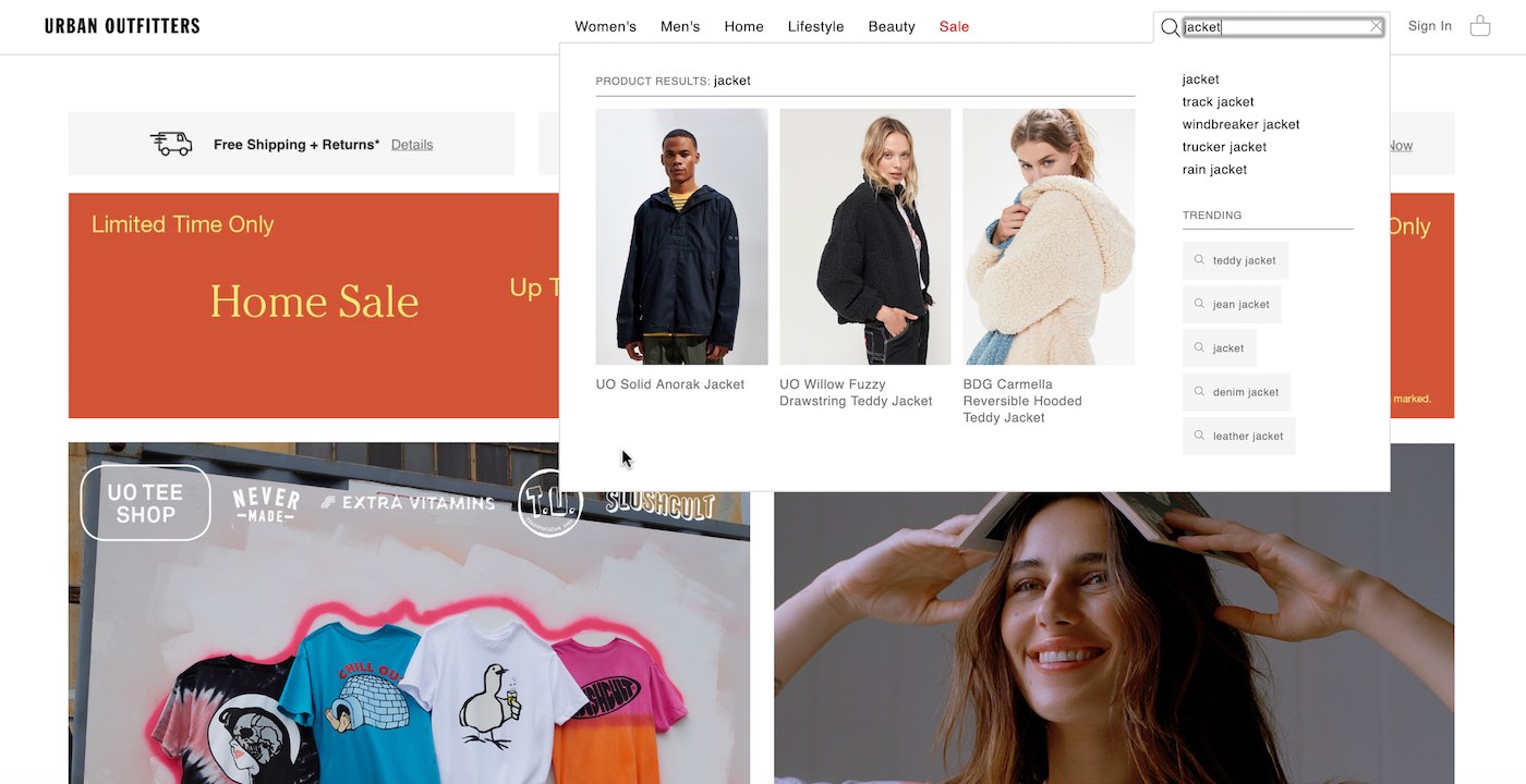 Urban Outfitters’s autocomplete feature includes product suggestions and trending searches that visually overpower the actual autocomplete suggestions, which can distract users from starting their search.
