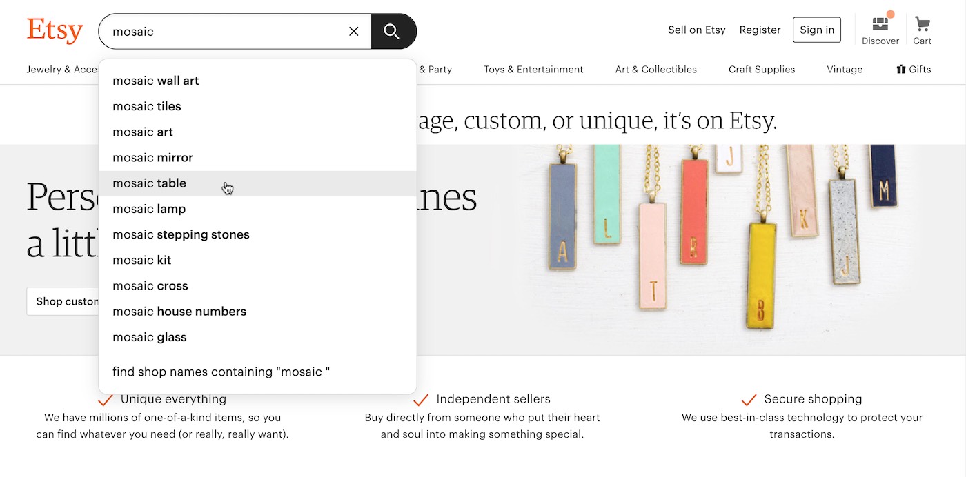 At Etsy, the active autocomplete suggestion uses background shading and the hand cursor is invoked, making a clear visual connection between the suggestion and the mouse hover point. The shading eliminates any doubt about where a user currently is, whether they are hovering with their mouse or using their keyboard.