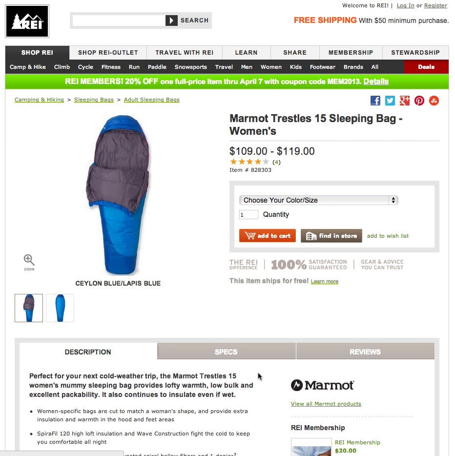 “I’m just looking for a number [the temperature rating]. This is crucial to buying a sleeping bag”, a user said before abandoning REI in anger. At REI 43% of users completely overlooked the horizontal tabs, despite actively searching the page for information only available within the “Specs” and “Reviews” tabs.