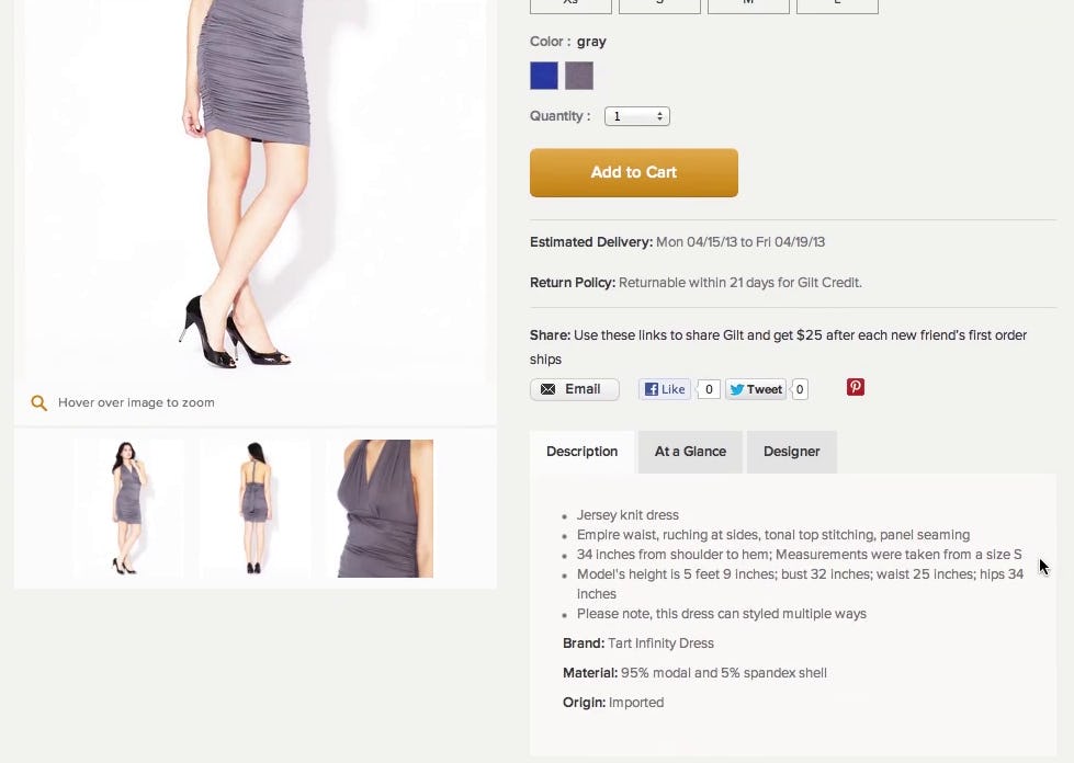 At Gilt, tabs were also skipped: “I don’t care about the ‘designer’, just about how it looks”, a user said, never exploring the content within “At A Glance” or “Designer”. In particular, “accidental discovery” is observed to be lower on product page layouts where the content sections are collapsed, especially in “Horizontal Tabs” layouts.