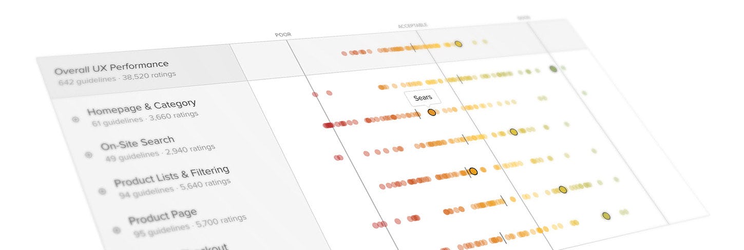 - The 6 individual UX performance benchmarks now also have an additional meta benchmark layer that summarize the overall e-commerce performance of 60 major e-commerce sites. We no longer just tell you who has “the best Cart & Checkout experience” — we now also tell you who has “the best overall e-commerce UX”.