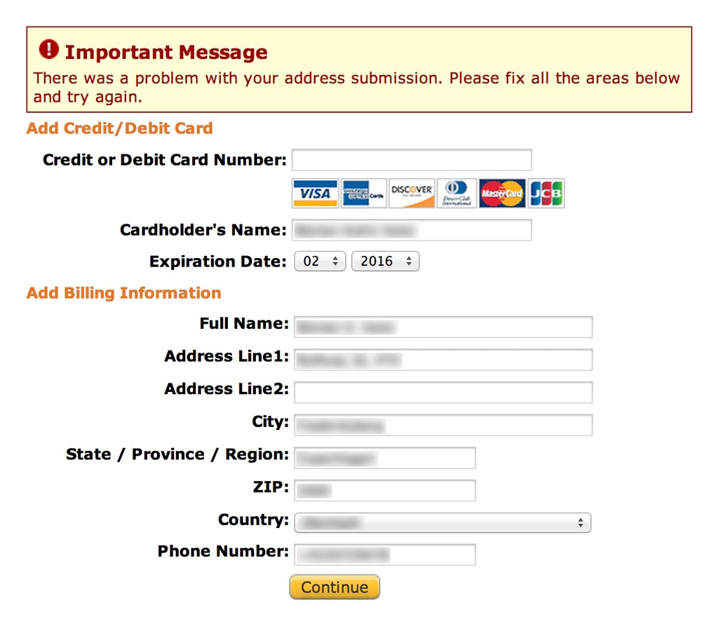 During our most recent usability audits we’ve run into checkout errors such as: the browser back-button breaking user expectations in accordion flows, credit card type detection only working when the card number is written without spaces, “Learn more” links opening the wrong help pages, the “Different billing address” checkbox not working when going backwards in the checkout flow, an “SSL Security” help page hijacking the entire checkout window, and users getting error pages when returning from a 3rd party payment page, and the list just goes on and on. The fact that these types of errors occur frequently during the checkout process on live production sites of multi-million dollar brands, underscores the importance of continuous on-going testing of key pages and processes.