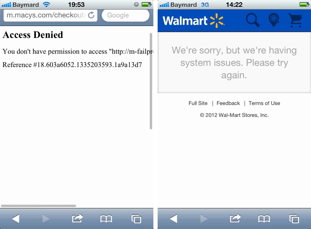 Compare the Walmart error to Macy’s “Back in a few..” site maintenance page – one leaves the user with little other to do than leave the site, whereas Macy’s give their users alternatives such as calling customer service.