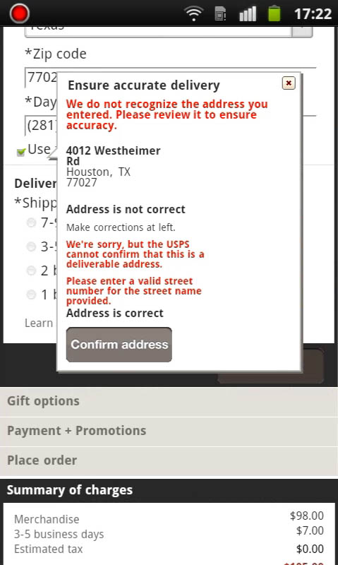 Here a front-end coding bug results in a rather contradictory set of messages to the user: first the user is told to review their address to ensure its accuracy, then a bolded line states “Address is not correct”, then the user is told that they must “enter a valid street number”, and finally, a new bolded line states “Address is correct”, followed by a button asking the user to “Confirm address”. Confused yet? Having bugs like this in the checkout process is a sure-fire way to drive up abandonments.