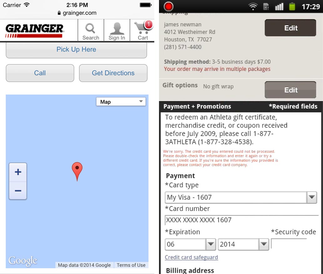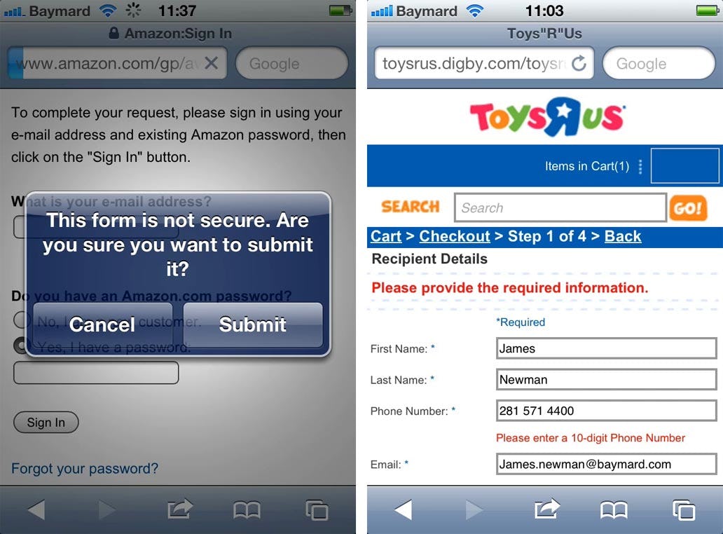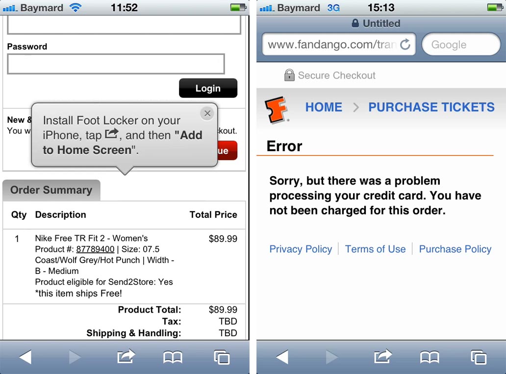 Amazon’s sign in form provokes security errors. Toys’R’Us’ checkout process yields errors for perfectly valid phone numbers. Footlocker’s checkout has boxes flying around the screen, covering the ‘continue’ button and key information. Fandango tells the user they couldn’t charge their card, but doesn’t give them a way to try a new one. These aren’t exactly minor errors, on obscure pages, on miniscule sites…