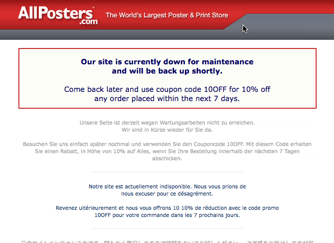 Now, we’d be remiss not to touch upon server errors and site maintenance, things that take down the entire site and prevent the user from proceeding. Obviously these should be minimized to the extent possible – that’s a given. However, if we accept that some degree of server errors and the occasional site maintenance is unavoidable, then the question should be: are there ways to make that experience a little less painful?