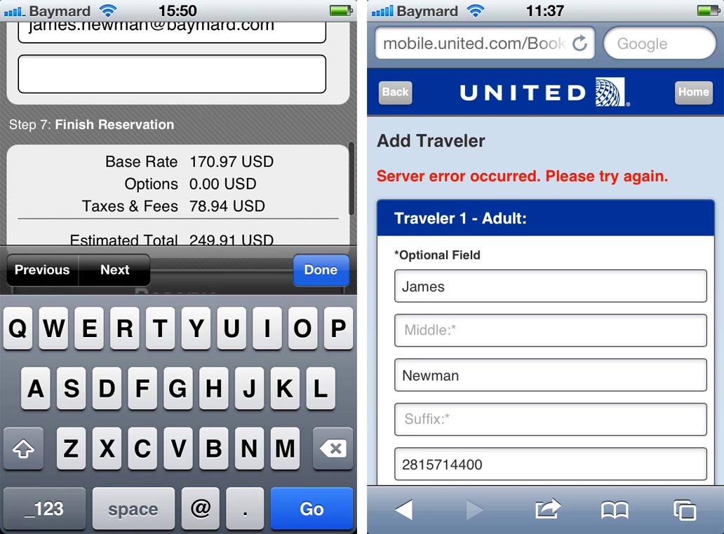 Even major brands have fundamental flaws in key processes – here a blank field in AVIS’ booking process (what on earth are you supposed to enter there!?), and a rather unhelpful error message on United Airlines.