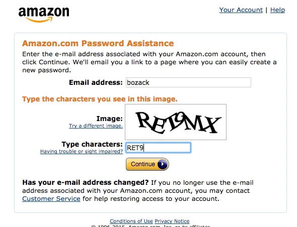 Only 66% of users during our qualitative usability testing successfully entered the CAPTCHA on the first attempt. One wondered at Amazon, “Hmm. Is this a 9 or an L?” Another sarcastically remarked, “Then it’s always nice when you have to type one of these. Now this time you can see what it says, but I often think that you can’t.”