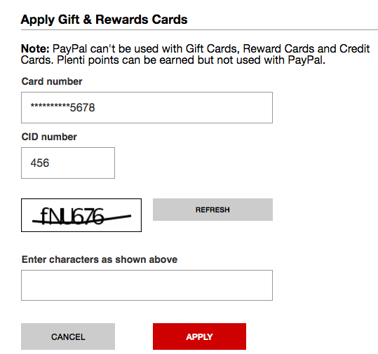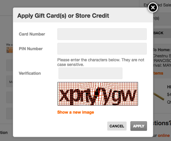 At Home Depot, if there’s a validation error with the gift card number or PIN users must reenter a CAPTCHA after correcting the input.