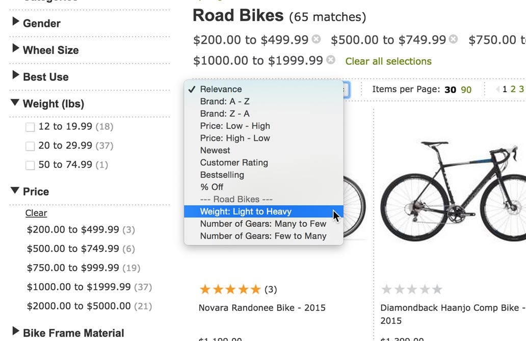 Now imagine in step #3, if the user had a category-specific sort type for “Weight”. If instead of applying “Weight” as a filter the user sorted the product list by weight (while keeping the $2,000 price filter in place), they would end up with a list of road bikes priced $2,000 or less sorted by lowest weight. The user would effectively have indicated their “lightweight” preference without having had to define highly precise cut-off points. Finally, the user would have a list of road bikes from lightest to heaviest costing $2,000 or below.