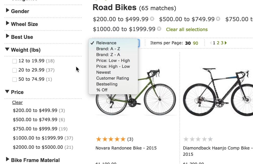 Let’s take an example of a user with a simple purchase preference: “I would like a lightweight road bike and my budget is $2,000.” Now, that wouldn’t be an unusual or odd request in a road bike store, but it would be a very difficult product-finding task at the 98% of e-commerce sites that don’t offer category-specific sort types, because the “lightweight” preference isn’t suited for a “hard” boundary filter (but instead needs the soft boundary of a sort type).