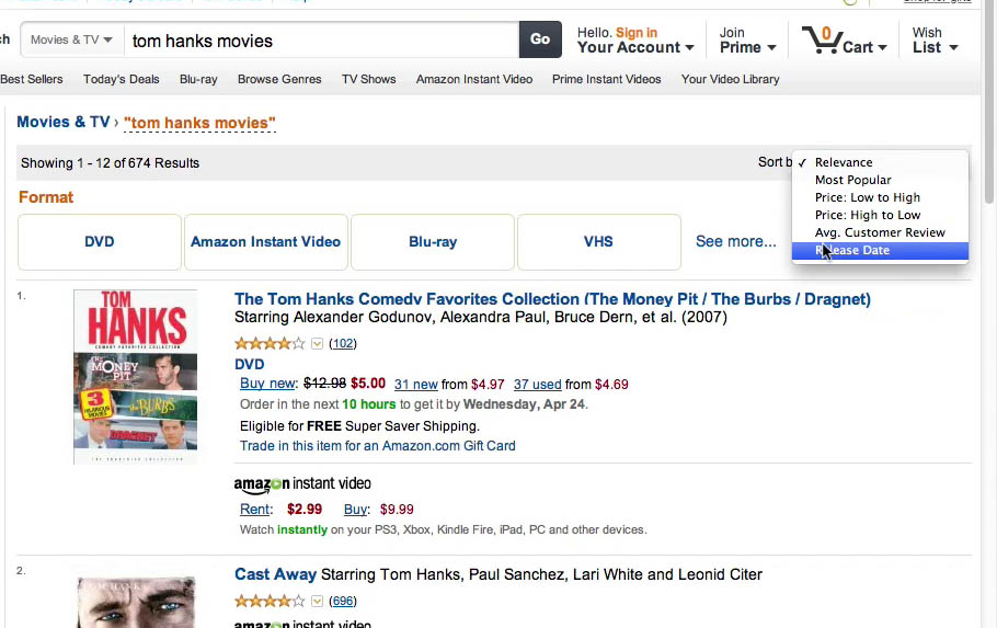 The closest we came to a meaningful category-specific sort type during testing was at Amazon which have a special “Release date” sorting option within their “Movies & TV” scope. The attribute is unique to the category and dates obviously have a natural progression. Unfortunately it is a rather ambiguous product attribute since it isn’t clear if it is the premiere date of the movie or the day the DVD version was released – something that tripped up numerous subjects during the usability tests.
