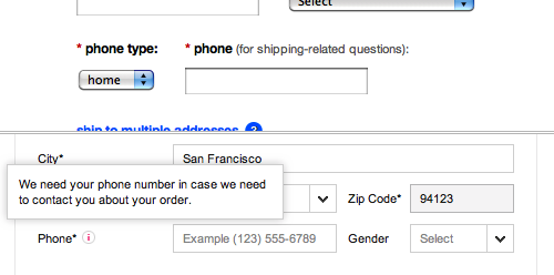 A decent explanation for a phone number field that was generally accepted by the test subjects went something along the lines of: Only used to contact you in case of problems with your order or delivery. The best way of explaining “why” is by stating it directly in the field’s description, and not hiding it behind a link or a tooltip (although a tooltip is much better than not explaining it at all).