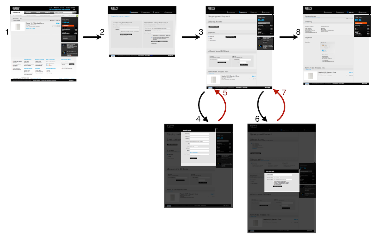 Let’s also take a look at the non-linear Sony checkout process as it’s a slightly different implementation with dialogs for each sub-step.