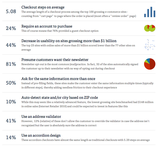 Today we’re launching a checkout usability benchmark of the top 100 grossing e-commerce sites, all audited across 63 checkout usability guidelines. It’s currently the most comprehensive e-commerce checkout database in the world, with 3,000+ examples of best (and worst) practice from the top 100 grossing e-commerce sites in the US.