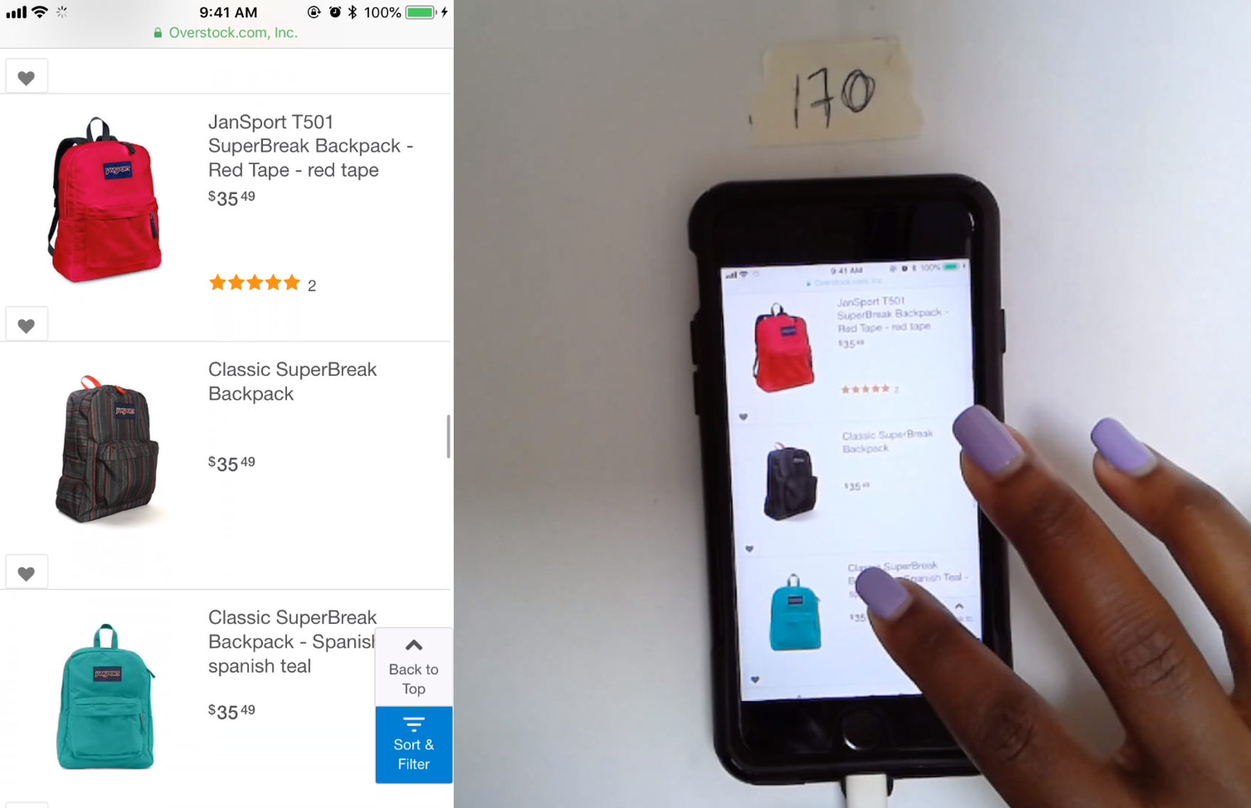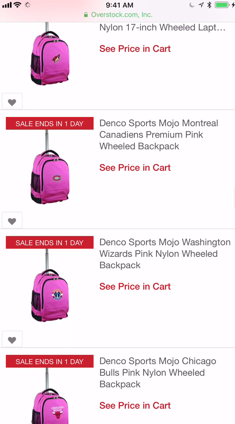 On Overstock, different color variations of the same backpack made it hard for test users to get an overview of the product range (this site lists over 3,000 backpacks). This issue is compounded by the fact that the thumbnails are shot from different angles, increasing the likelihood that users might think that the thumbnails are depicting different products rather than variations of one product.