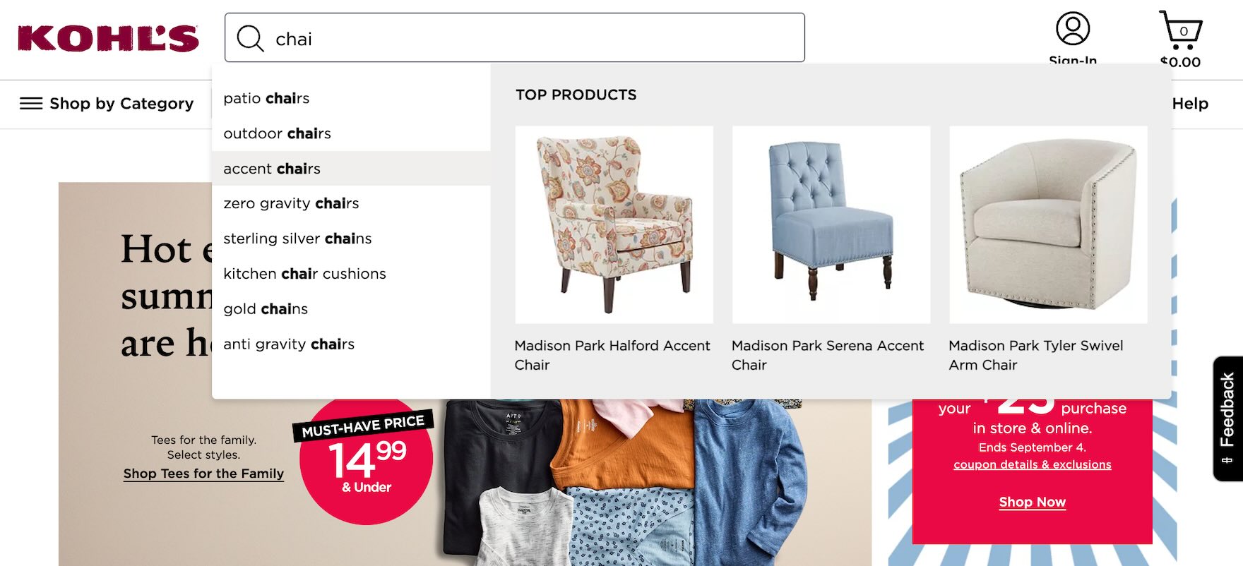 When a user types “chai” on Kohl’s, the highlighted suggestion (“accent chairs”) isn’t copied to the search field. This means that users can’t edit suggestions before submitting them, reducing their usefulness significantly.