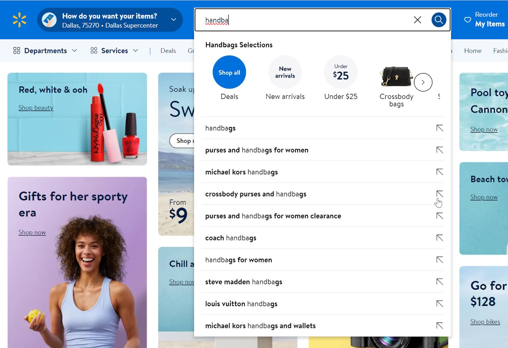 Autocomplete suggestions on Walmart can be copied to the search box by simply clicking on the “arrow” alongside each one (e.g., the suggestion for “crossbody purses and handbags”). This speeds up the process of selecting and editing suggestions for those who prefer to use the mouse.