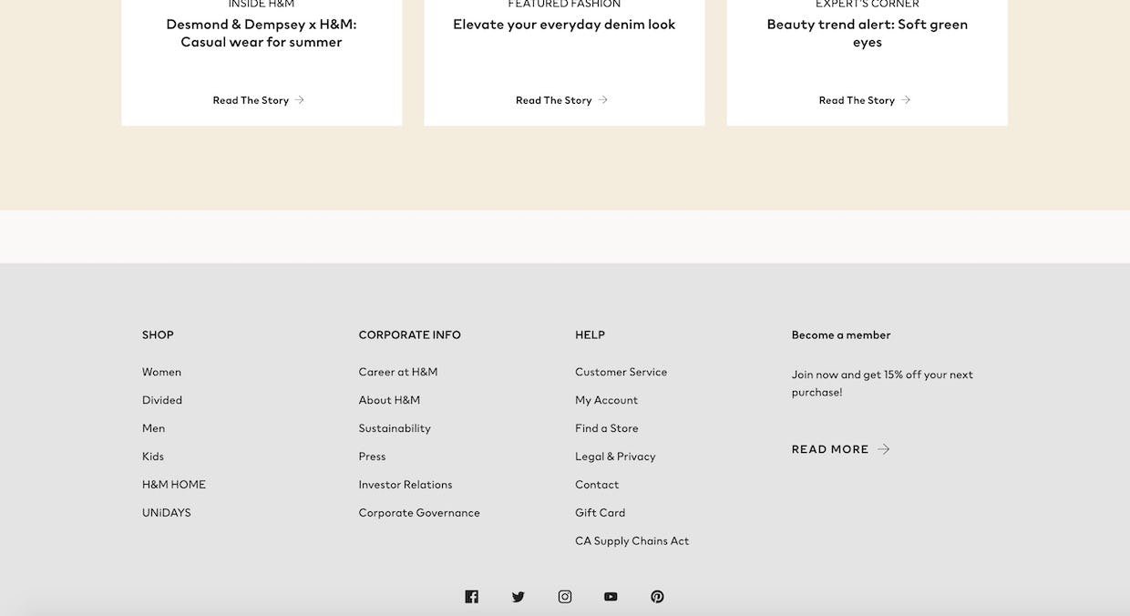 H&M doesn’t include direct links to either shipping or return info in the footer — failing to meet the expectations of users who will assume the links will be there.