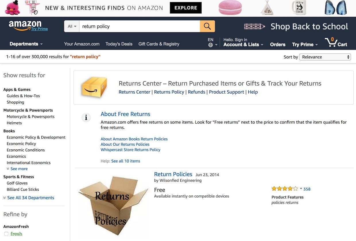 Searching for “return policy” on Amazon yields return center links, as well as a short description of the return policy along with a set of links to relevant help sections.