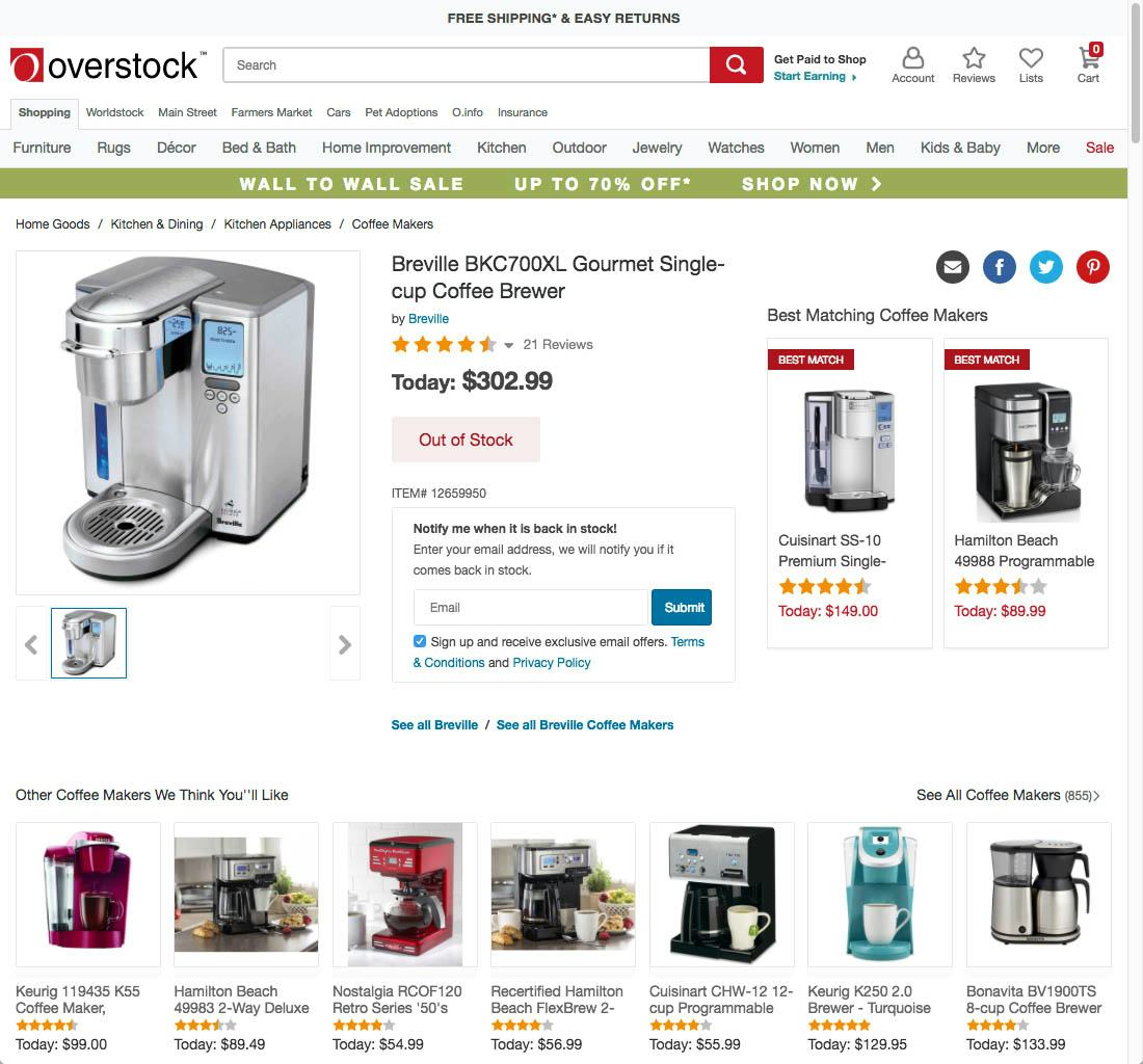Telling users a product is out of stock and removing the “Add to Cart” button, as is the case here at Overstock, brings them to a complete halt and prevents the user from purchasing the item.