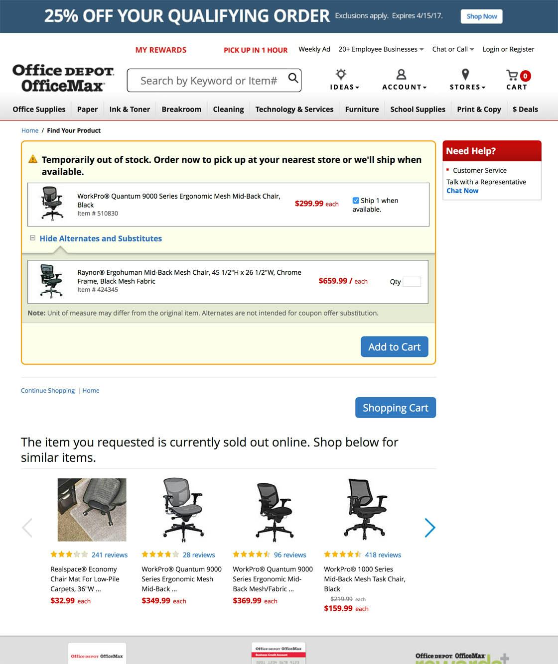 Office Depot allows users to purchase the out of stock chair but also promotes alternatives for users to consider. Users are given multiple options for adding a suitable product to the cart and finding a chair they like on the site.
